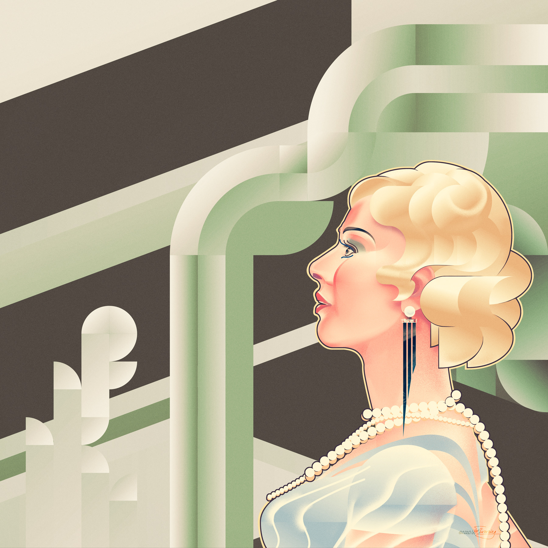 The couple would eventually vanish from the canvas - and appear in a real space, while the pattern would remind the viewer of a stylized Art Deco building...